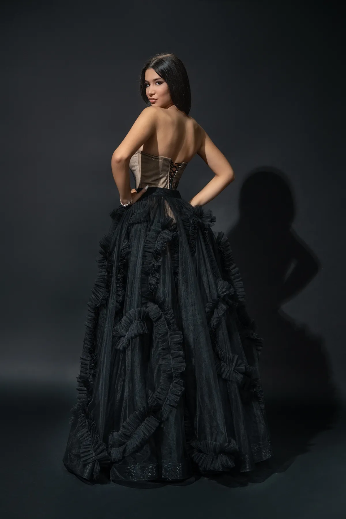 • Допълнителната дълга пола на дизайнерска рокля АТИКА е обемна от десетки метри тюл в черен цвят