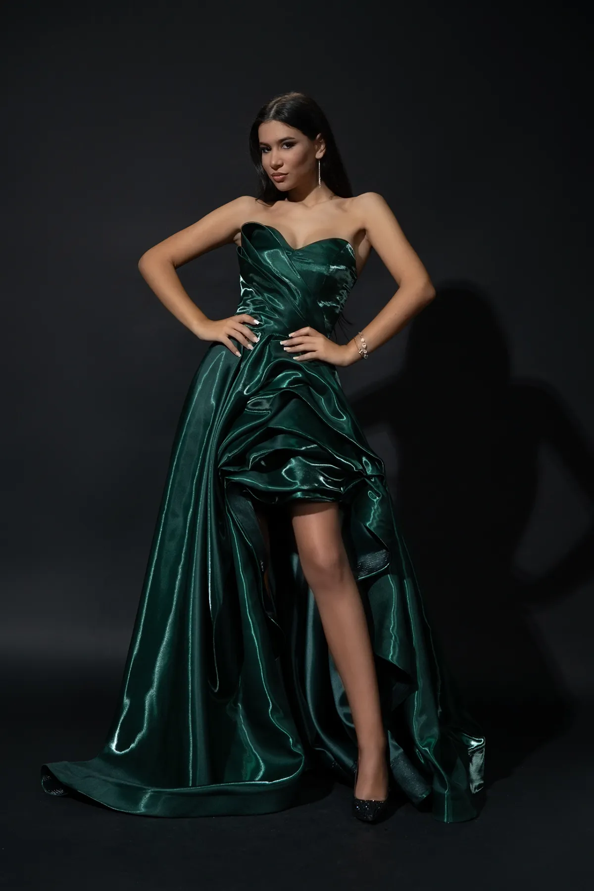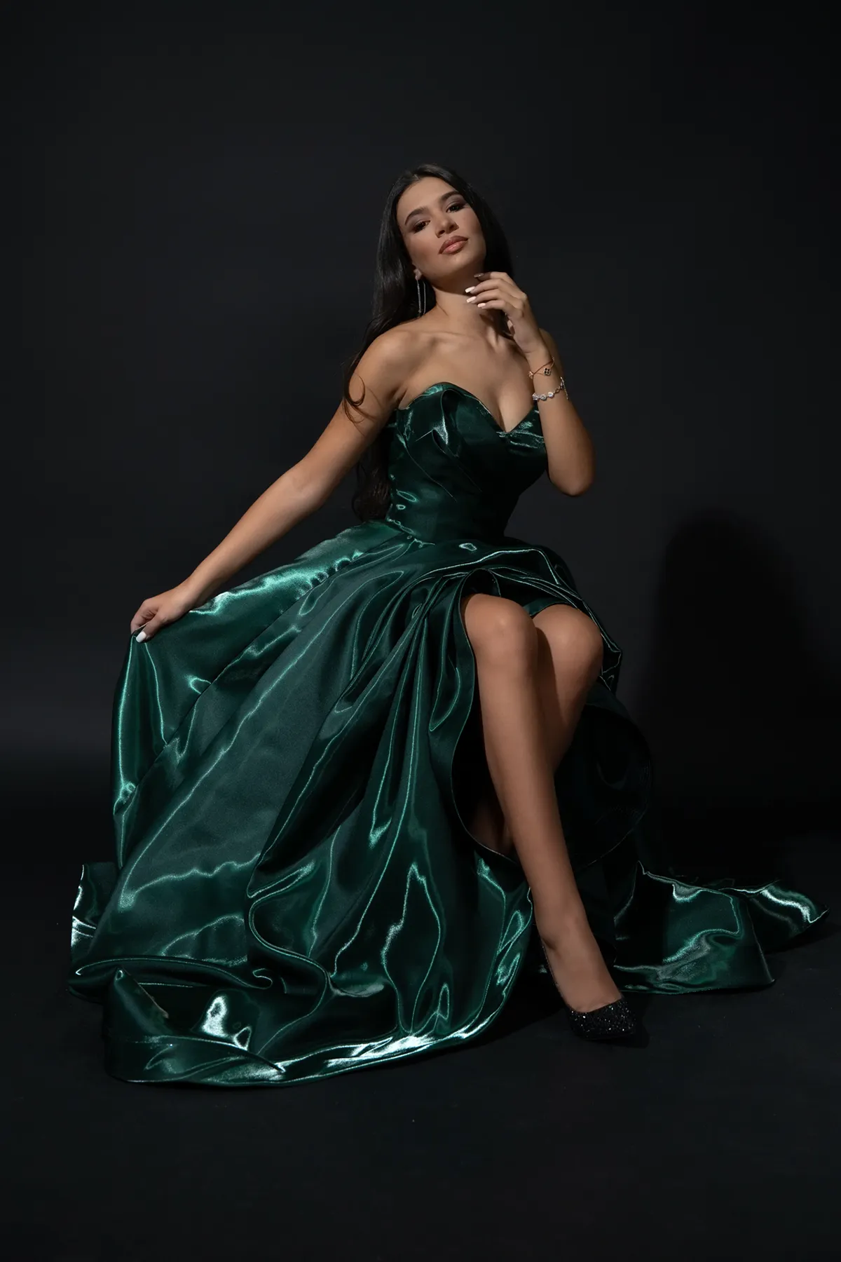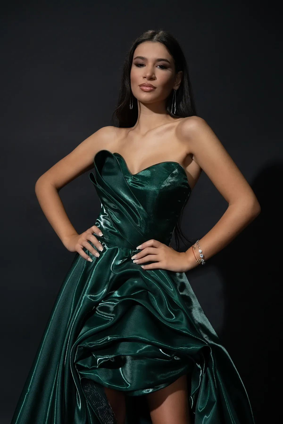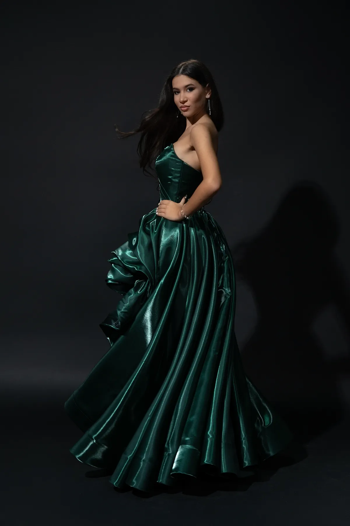 • Цвета на роклята е богато, маслено зелено, което прелива в сребристо, заради течния ефект на сатена